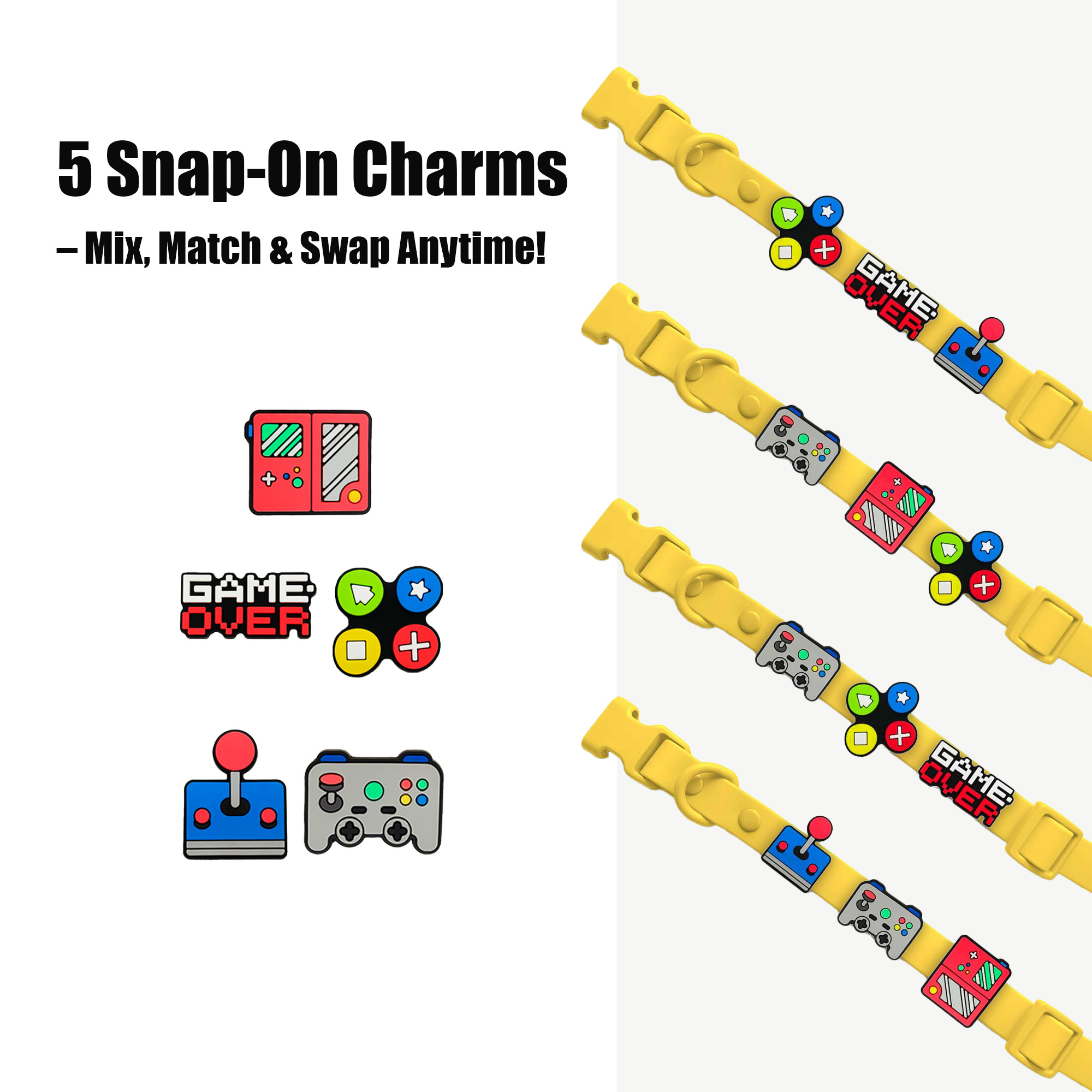 Controllers, power-ups, and retro arcade icons — right into the collar’s “game slots.” Like swapping cartridges, every mix-and-match unlocks a fresh new style for every outing.