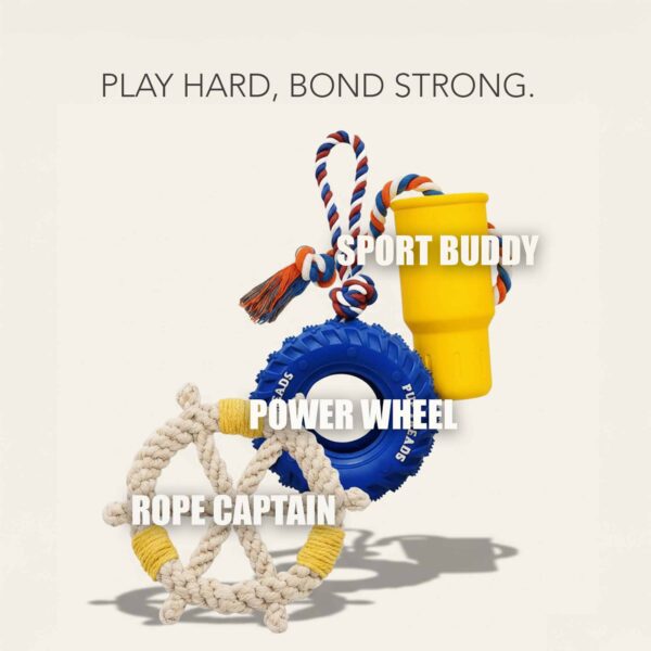 • Treat Tire: Durable, non‑toxic rubber with through‑rope channel and treat cavity.